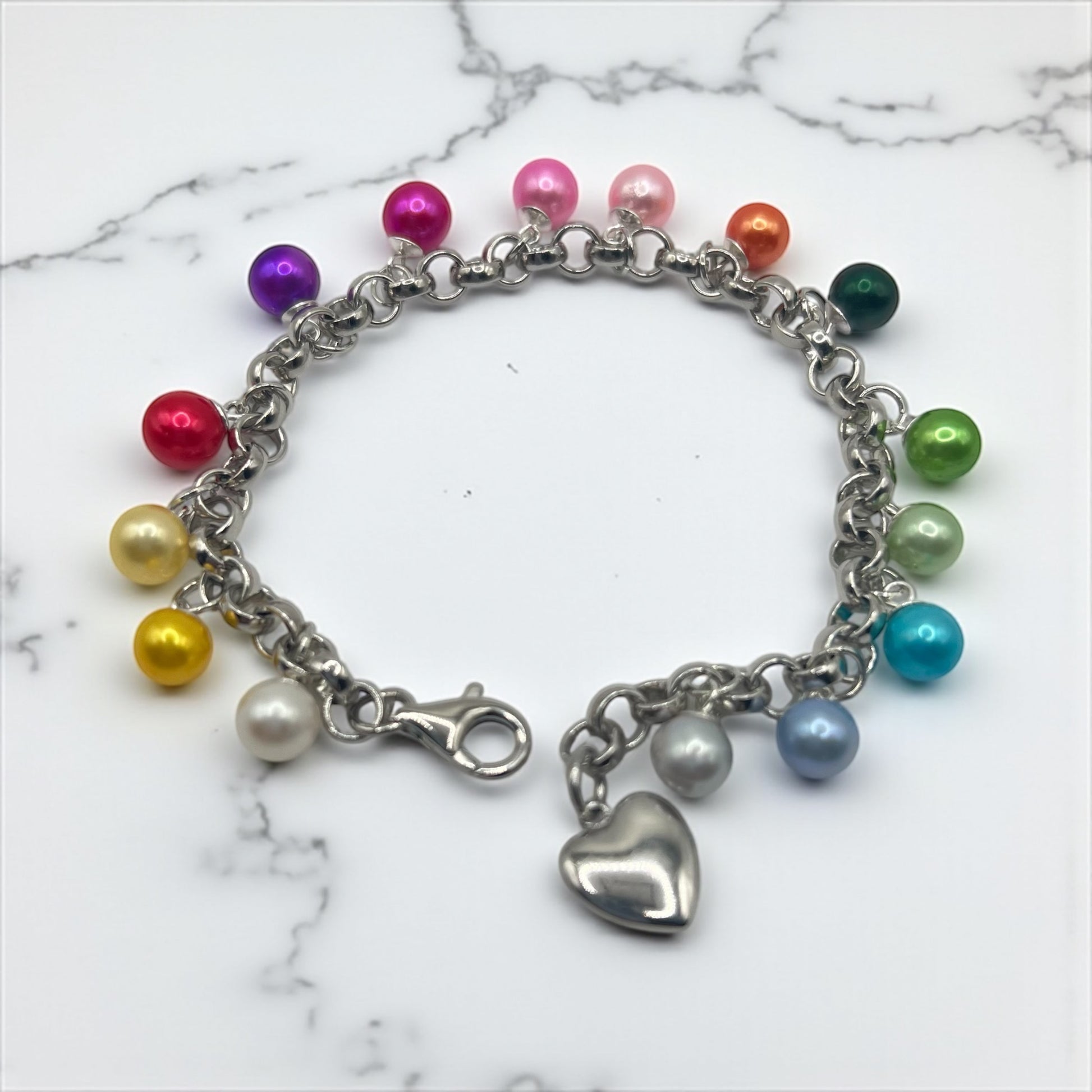 Crafted from durable stainless steel and sterling silver, this 7.5" Limited Edition Rainbow True Love Bracelet features a stunning array of vibrant rainbow pearls. Its elegant design promises lasting beauty and a unique touch to any outfit, making it the perfect symbol of true love and individuality. Elevate your style with this eye-catching piece that combines quality with colorful charm.